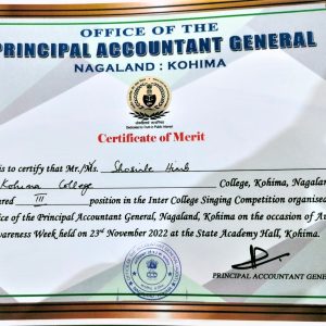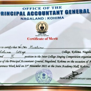 2 students from Kohima College, Muzhimu & Shosinle Himb, represented Kohima College at the Inter-Collegiate Singing Competition bagging the 3rd position. It was organised by the Office of the Principal Accountant General to celebrate “Audit Awareness Week” & held at the State Academy Hall, Kohima, Nagaland.