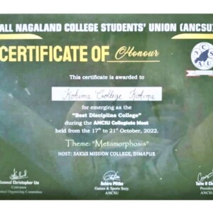 17th—21st August, 2022: Kohima College honoured with the “Best Discipline College” at the ANGSU Collegiate Meet 2022, Sakus Mission College, Dimapur, Nagaland