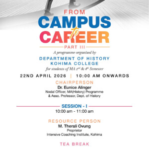 The programme From Campus to Career – Part III was organized by the Department of History, Kohima College on 22nd April 2026, from 10:00 a.m. onwards for the 2nd Year and 4th Semester M.A. students of History and Political Science. The objective of the programme was to guide students in preparing for their careers and to equip them with the necessary skills and confidence to pursue opportunities beyond academics, particularly in competitive examinations.
