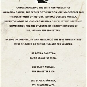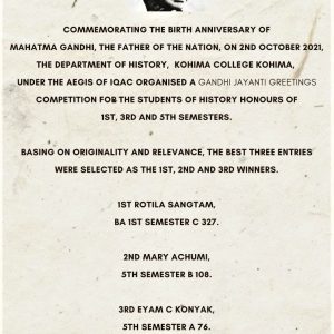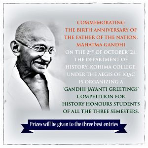 2nd October, 2021: Department of History in collaboration with IQAC, KCK, organised a Gandhi Jayanti Greetings Competition for the History Honour students of 1st , 3rd & 5th Semesters on the occasion of Mahatma Gandhi’s Birth Anniversary