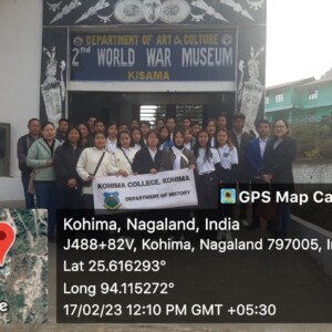 February 17, 2023: 22 students of 6th semester (History hons) accompanied by 6 teachers from History dept., KCK went on an educational tour to the Kisama Heritage Village and the 2nd World War Museum.The students were guided through the museum by the teachers, who explained in detail the history of the Battle of Kohima that took place during the 2nd World War.