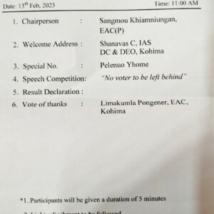 13th February, 2023: Hyulo Tsela, 6th Semester of Kohima College secured the 2nd position at the Inter-Collegiate Speech Competition themed “No Voter to be left behind”, held at Office of the Deputy Commissioner, District Election Officer, Kohima
