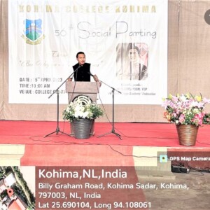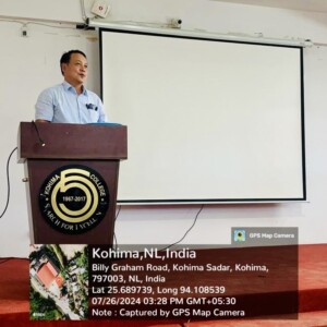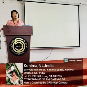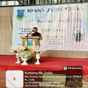 The program was led by Sarah Ezung and began with an invocation by Tenosenuo Angami, Associate Professor. Dr. Vitsosie Vüprü, Principal of Kohima College, Kohima, delivered the welcome address. In his welcome address, Dr. Vüprü emphasised the importance of hard work and urged students to learn good traits from their seniors, wishing them a successful and meaningful stay at the college.