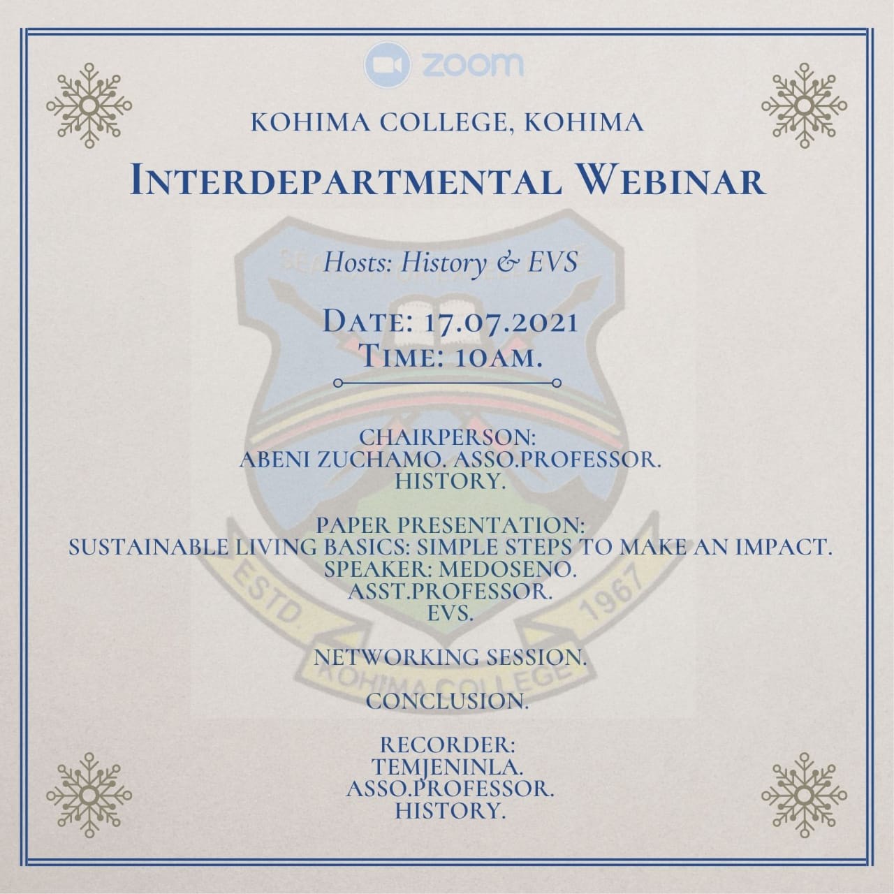 Inter-Departmental Webinar (History & EVS) 16/07/2021 The Department of History & the Department of EVS organises an Inter-Departmental Webinar on the topic “Sustainable Living Basics: Simple Steps to Make an Impact” presented by by Smti. Medoseno Thapo, Asst. Professor, Dept. of EVS.