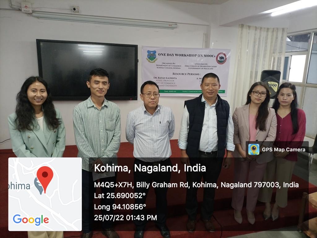 N July 25, 2022: One Day Workshop on MOOCs (Massive Open Online Courses) organised by the Department of Commerce, KCK & sponsored by Directorate of Higher Education, Govt. of Nagaland.m Resource persons for the workshop were Dr. Ratan Kaurinta, Assoc Professor, Dept.of Commerce, Nagaland University & A Morimenba Amer, Joint Director, NIELIT, Kohima.