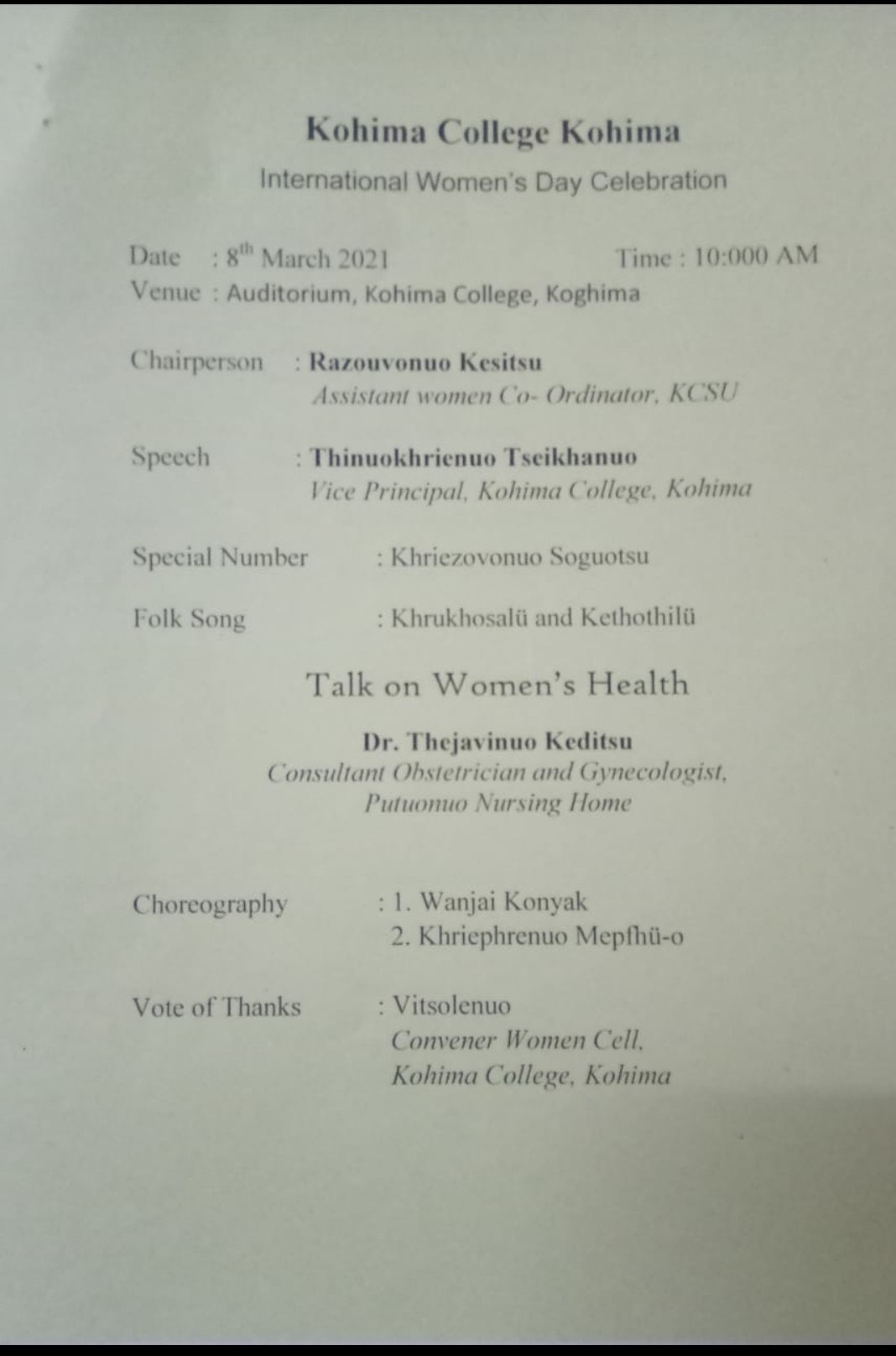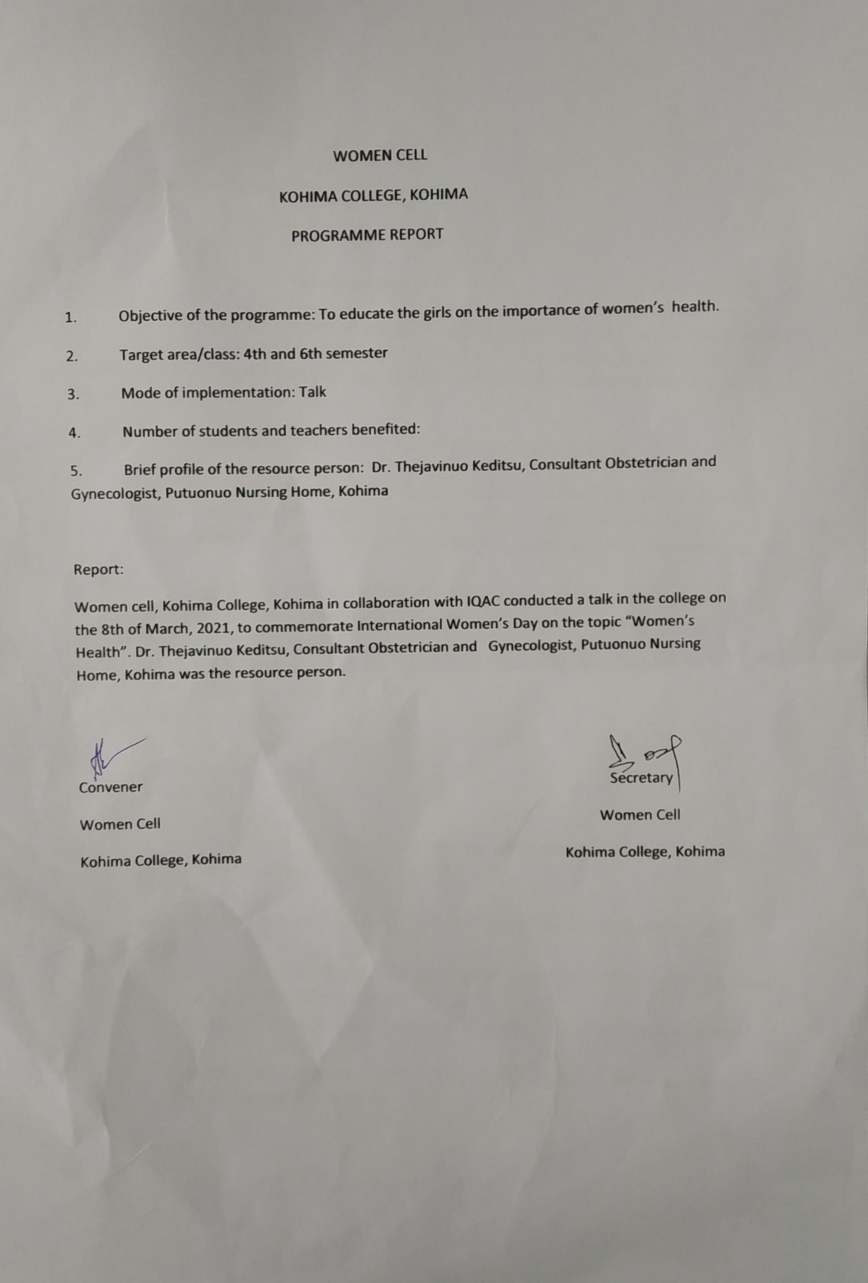 March 8, 2021: To commemorate International Women’s Day, Women Cell organises a Talk on Women’s Health with guest speaker Dr. Thejavinuo Keditsu, Consultant Obstetrician and Gynaecologist, Putuonuo Nursing Home.